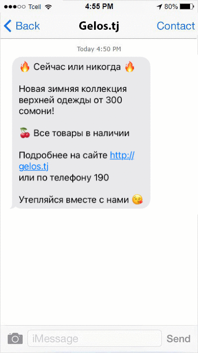 Цена за SMS зависит от количества ежемесячно отправленных сообщений и начинается от 0,05 Cомони